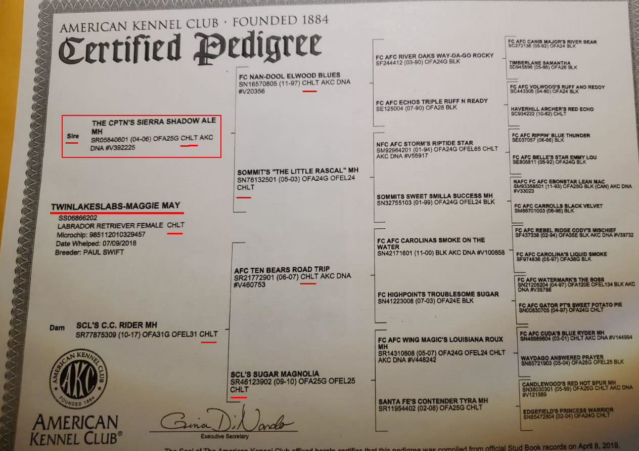 Maggie's lineage above, note that her dad is 'The Cptn's Sierra Shadow Ale' also know by his call-sign 'Porter'.